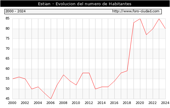 el numero de habitantes en Estian era de 80, 5 habitantes menos que el en el año 2023. En el grafico siguiente se puede ver cuantos habitantes tiene Estian a lo largo de los años.