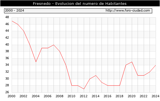 el numero de habitantes en Fresnedo era de 34, 2 habitantes mas que el en el año 2023. En el grafico siguiente se puede ver cuantos habitantes tiene Fresnedo a lo largo de los años.