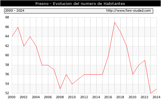 el numero de habitantes en Fresno era de 53, 1 habitantes mas que el en el año 2023. En el grafico siguiente se puede ver cuantos habitantes tiene Fresno a lo largo de los años.