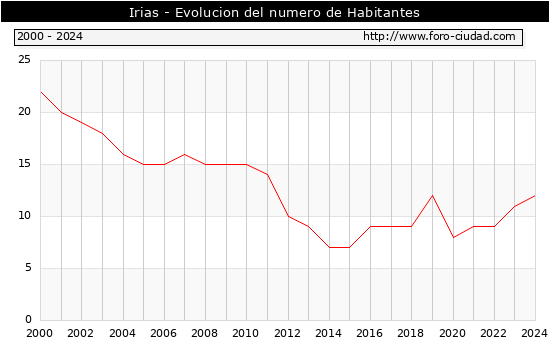 el numero de habitantes en Irias era de 12, 1 habitantes mas que el en el año 2023. En el grafico siguiente se puede ver cuantos habitantes tiene Irias a lo largo de los años.