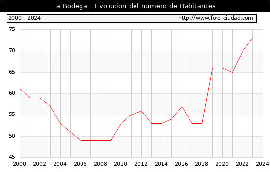 el numero de habitantes en La Bodega era de 73, igual numero de habitantes que el en el año 2023. En el grafico siguiente se puede ver cuantos habitantes tiene La Bodega a lo largo de los años.