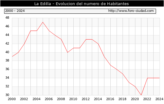 Segun los datos publicados por el INE a 1 de Enero de 2024 el numero de habitantes en La Edilla era de 34, igual numero de habitantes que el en el año 2023. En el grafico siguiente se puede ver cuantos habitantes tiene La Edilla a lo largo de los años.