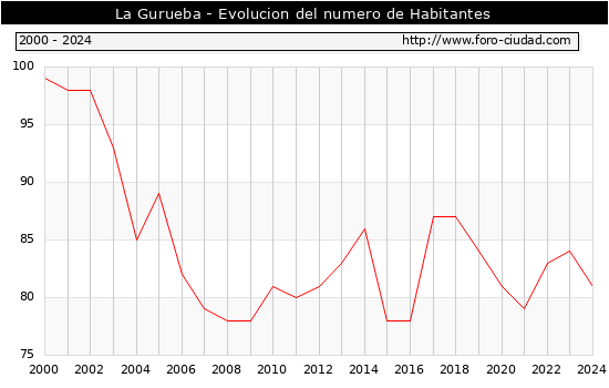 el numero de habitantes en La Gurueba era de 81, 3 habitantes menos que el en el año 2023. En el grafico siguiente se puede ver cuantos habitantes tiene La Gurueba a lo largo de los años.