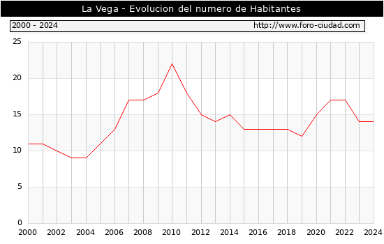 el numero de habitantes en La Vega era de 14, igual numero de habitantes que el en el año 2023. En el grafico siguiente se puede ver cuantos habitantes tiene La Vega a lo largo de los años.