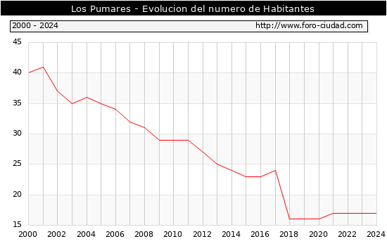 Segun los datos publicados por el INE a 1 de Enero de 2024 el numero de habitantes en Los Pumares era de 17, igual numero de habitantes que el en el año 2023. En el grafico siguiente se puede ver cuantos habitantes tiene Los Pumares a lo largo de los años.