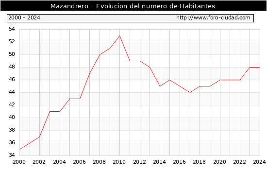 el numero de habitantes en Mazandrero era de 48, igual numero de habitantes que el en el año 2023. En el grafico siguiente se puede ver cuantos habitantes tiene Mazandrero a lo largo de los años.