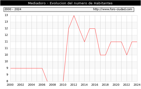 el numero de habitantes en Mediadoro era de 11, igual numero de habitantes que el en el año 2023. En el grafico siguiente se puede ver cuantos habitantes tiene Mediadoro a lo largo de los años.