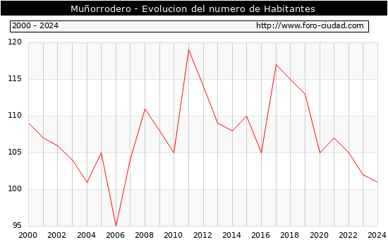 el numero de habitantes en Muñorrodero era de 101, 1 habitantes menos que el en el año 2023. En el grafico siguiente se puede ver cuantos habitantes tiene Muñorrodero a lo largo de los años.