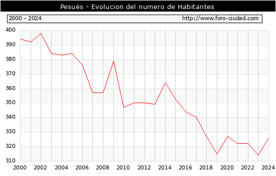 el numero de habitantes en Pesués era de 326, 12 habitantes mas que el en el año 2023. En el grafico siguiente se puede ver cuantos habitantes tiene Pesués a lo largo de los años.