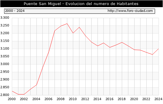 el numero de habitantes en Puente San Miguel era de 3.102, 38 habitantes mas que el en el año 2023. En el grafico siguiente se puede ver cuantos habitantes tiene Puente San Miguel a lo largo de los años.