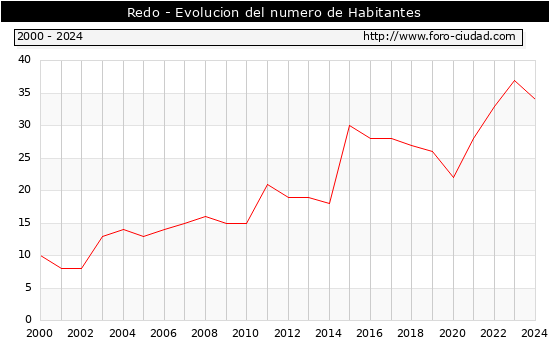 el numero de habitantes en Redo era de 34, 3 habitantes menos que el en el año 2023. En el grafico siguiente se puede ver cuantos habitantes tiene Redo a lo largo de los años.