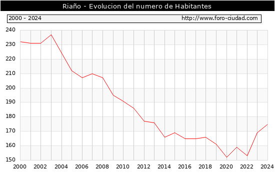 el numero de habitantes en Riaño era de 175, 6 habitantes mas que el en el año 2023. En el grafico siguiente se puede ver cuantos habitantes tiene Riaño a lo largo de los años.