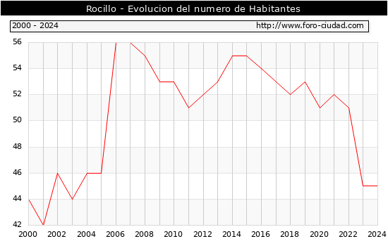 el numero de habitantes en Rocillo era de 45, igual numero de habitantes que el en el año 2023. En el grafico siguiente se puede ver cuantos habitantes tiene Rocillo a lo largo de los años.