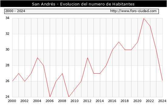 el numero de habitantes en San Andrés era de 26, 4 habitantes menos que el en el año 2023. En el grafico siguiente se puede ver cuantos habitantes tiene San Andrés a lo largo de los años.