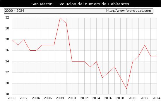 el numero de habitantes en San Martín era de 25, igual numero de habitantes que el en el año 2023. En el grafico siguiente se puede ver cuantos habitantes tiene San Martín a lo largo de los años.