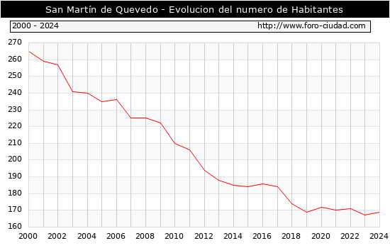 el numero de habitantes en San Martín de Quevedo era de 169, 2 habitantes mas que el en el año 2023. En el grafico siguiente se puede ver cuantos habitantes tiene San Martín de Quevedo a lo largo de los años.