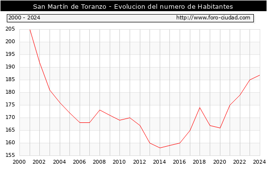 el numero de habitantes en San Martín de Toranzo era de 187, 2 habitantes mas que el en el año 2023. En el grafico siguiente se puede ver cuantos habitantes tiene San Martín de Toranzo a lo largo de los años.