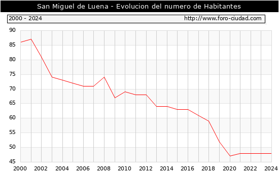el numero de habitantes en San Miguel de Luena era de 48, igual numero de habitantes que el en el año 2023. En el grafico siguiente se puede ver cuantos habitantes tiene San Miguel de Luena a lo largo de los años.