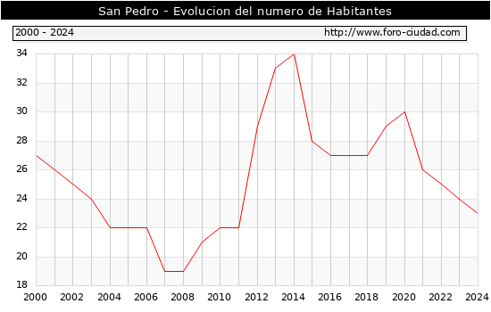 el numero de habitantes en San Pedro era de 23, 1 habitantes menos que el en el año 2023. En el grafico siguiente se puede ver cuantos habitantes tiene San Pedro a lo largo de los años.