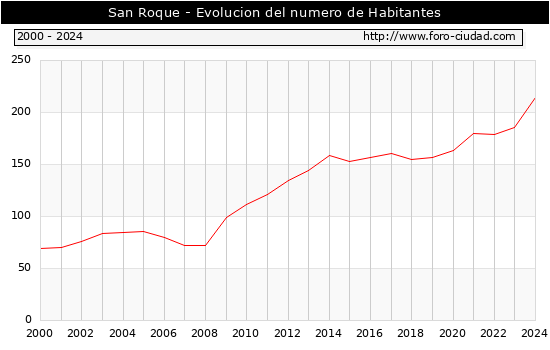 el numero de habitantes en San Roque era de 214, 28 habitantes mas que el en el año 2023. En el grafico siguiente se puede ver cuantos habitantes tiene San Roque a lo largo de los años.