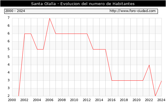 el numero de habitantes en Santa Olalla era de 3, 1 habitantes mas que el en el año 2023. En el grafico siguiente se puede ver cuantos habitantes tiene Santa Olalla a lo largo de los años.