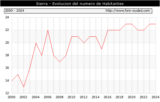 el numero de habitantes en Sierra era de 23, igual numero de habitantes que el en el año 2023. En el grafico siguiente se puede ver cuantos habitantes tiene Sierra a lo largo de los años.