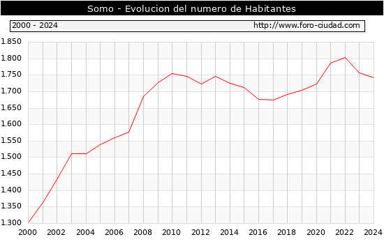 el numero de habitantes en Somo era de 1.742, 14 habitantes menos que el en el año 2023. En el grafico siguiente se puede ver cuantos habitantes tiene Somo a lo largo de los años.