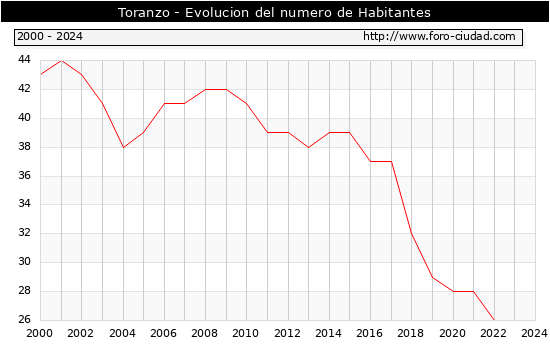 el numero de habitantes en Toranzo era de 26, igual numero de habitantes que el en el año 2023. En el grafico siguiente se puede ver cuantos habitantes tiene Toranzo a lo largo de los años.