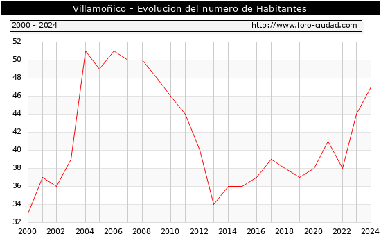 el numero de habitantes en Villamoņico era de 47, 3 habitantes mas que el en el aņo 2023. En el grafico siguiente se puede ver cuantos habitantes tiene Villamoņico a lo largo de los aņos.
