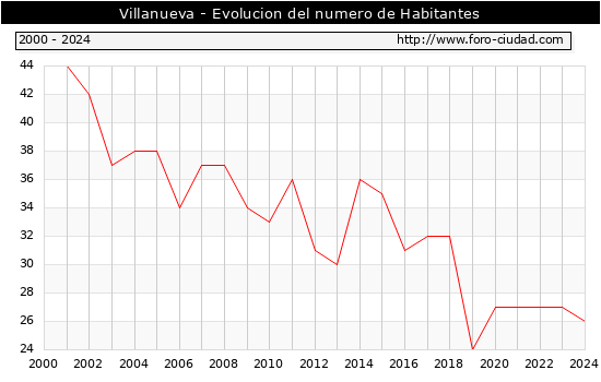 el numero de habitantes en Villanueva era de 26, 1 habitantes menos que el en el año 2023. En el grafico siguiente se puede ver cuantos habitantes tiene Villanueva a lo largo de los años.
