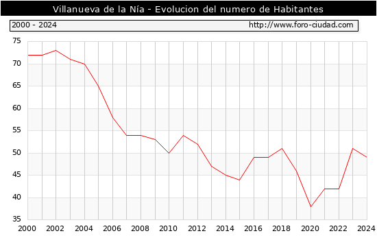el numero de habitantes en Villanueva de la Nía era de 49, 2 habitantes menos que el en el año 2023. En el grafico siguiente se puede ver cuantos habitantes tiene Villanueva de la Nía a lo largo de los años.