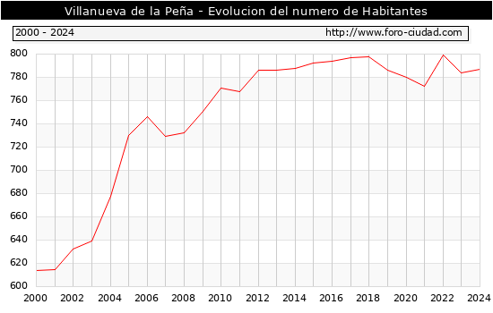 el numero de habitantes en Villanueva de la Peña era de 787, 3 habitantes mas que el en el año 2023. En el grafico siguiente se puede ver cuantos habitantes tiene Villanueva de la Peña a lo largo de los años.