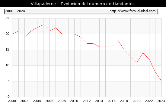 Segun los datos publicados por el INE a 1 de Enero de 2024 el numero de habitantes en Villapaderne era de 5, 3 habitantes menos que el en el año 2023. En el grafico siguiente se puede ver cuantos habitantes tiene Villapaderne a lo largo de los años.