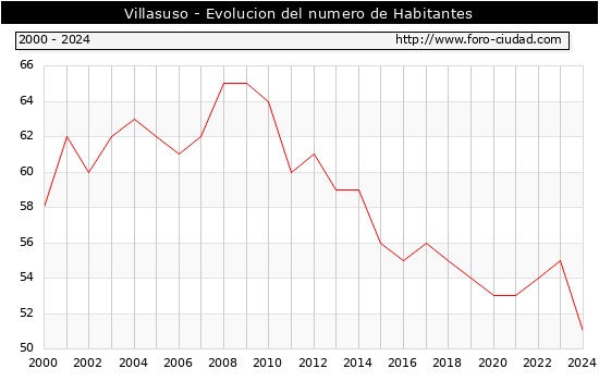 el numero de habitantes en Villasuso era de 51, 4 habitantes menos que el en el año 2023. En el grafico siguiente se puede ver cuantos habitantes tiene Villasuso a lo largo de los años.