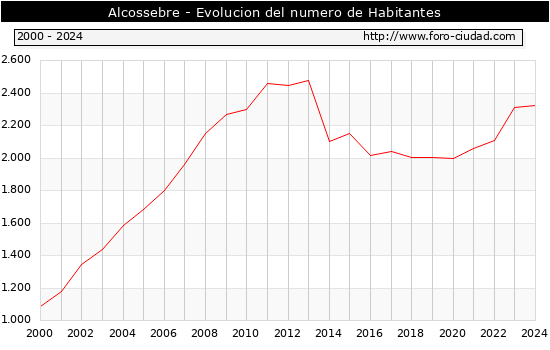 el numero de habitantes en Alcossebre era de 2.326, 16 habitantes mas que el en el año 2023. En el grafico siguiente se puede ver cuantos habitantes tiene Alcossebre a lo largo de los años.