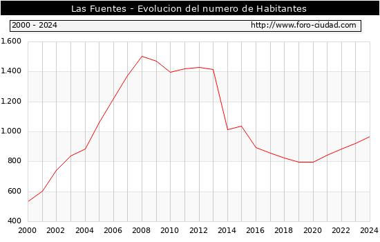 el numero de habitantes en Las Fuentes era de 969, 48 habitantes mas que el en el año 2023. En el grafico siguiente se puede ver cuantos habitantes tiene Las Fuentes a lo largo de los años.