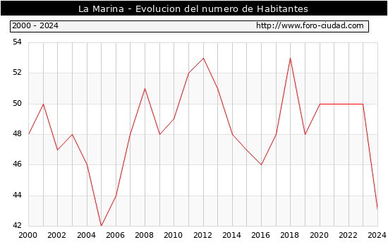 el numero de habitantes en La Marina era de 43, 7 habitantes menos que el en el año 2023. En el grafico siguiente se puede ver cuantos habitantes tiene La Marina a lo largo de los años.