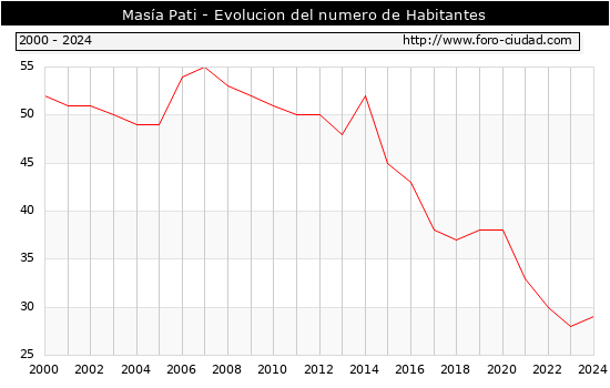 el numero de habitantes en Masía Pati era de 29, 1 habitantes mas que el en el año 2023. En el grafico siguiente se puede ver cuantos habitantes tiene Masía Pati a lo largo de los años.