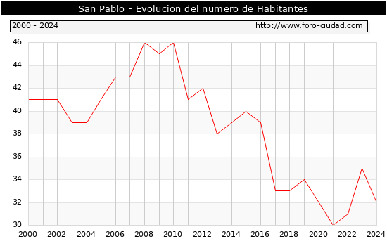 el numero de habitantes en San Pablo era de 32, 3 habitantes menos que el en el año 2023. En el grafico siguiente se puede ver cuantos habitantes tiene San Pablo a lo largo de los años.