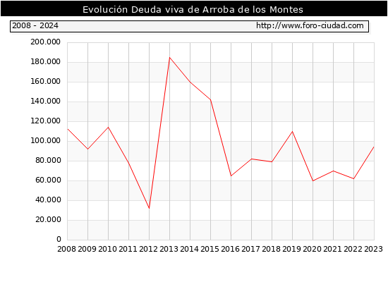 Arroba de los Montes - Deuda viva del Ayuntamiento a 31/12/2024 Arroba de los Montes - Deuda viva del Ayuntamiento a 31/12/2024 Segun el Ministerio de Economia y Hacienda el Ayuntamiento de Arroba de los Montes a 31/12/2024 posee una deuda de 46.000 € . La deuda viva a 31/12/2023 ascendia a 95.000 € por lo que en el ultimo año la deuda se redujo en -49.000 €. ![]()