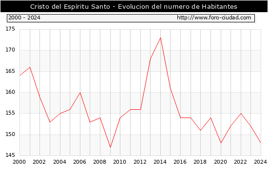 el numero de habitantes en Cristo del Espíritu Santo era de 148, 4 habitantes menos que el en el ańo 2023. En el grafico siguiente se puede ver cuantos habitantes tiene Cristo del Espíritu Santo a lo largo de los ańos.