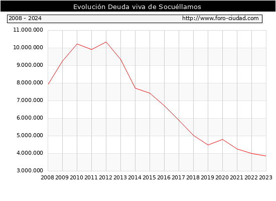 Socuéllamos - Deuda viva del Ayuntamiento a 31/12/2024 Socuéllamos - Deuda viva del Ayuntamiento a 31/12/2024 Segun el Ministerio de Economia y Hacienda el Ayuntamiento de Socuéllamos a 31/12/2024 posee una deuda de 3.058.000 € . La deuda viva a 31/12/2023 ascendia a 3.869.000 € por lo que en el ultimo año la deuda se redujo en -811.000 €. ![]()