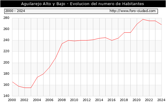 el numero de habitantes en Aguilarejo Alto y Bajo era de 268, 7 habitantes menos que el en el año 2023. En el grafico siguiente se puede ver cuantos habitantes tiene Aguilarejo Alto y Bajo a lo largo de los años.