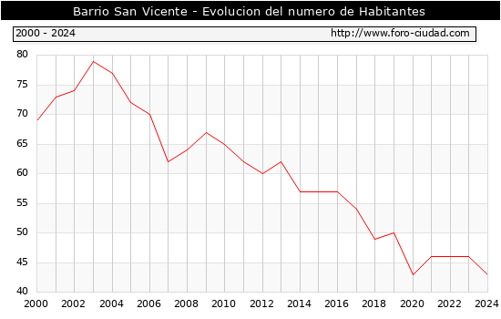 el numero de habitantes en Barrio San Vicente era de 43, 3 habitantes menos que el en el año 2023. En el grafico siguiente se puede ver cuantos habitantes tiene Barrio San Vicente a lo largo de los años.