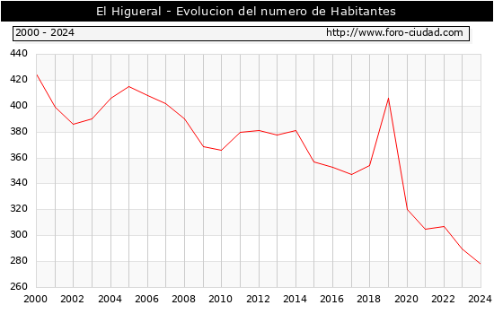el numero de habitantes en El Higueral era de 278, 12 habitantes menos que el en el año 2023. En el grafico siguiente se puede ver cuantos habitantes tiene El Higueral a lo largo de los años.