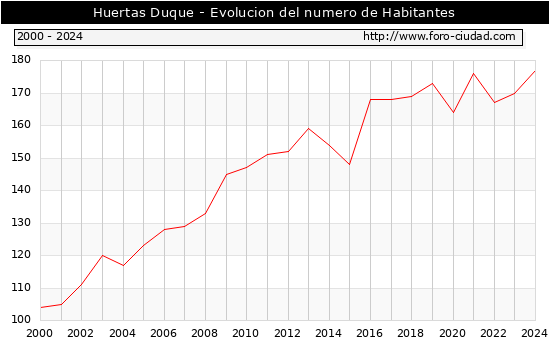 el numero de habitantes en Huertas Duque era de 177, 7 habitantes mas que el en el año 2023. En el grafico siguiente se puede ver cuantos habitantes tiene Huertas Duque a lo largo de los años.