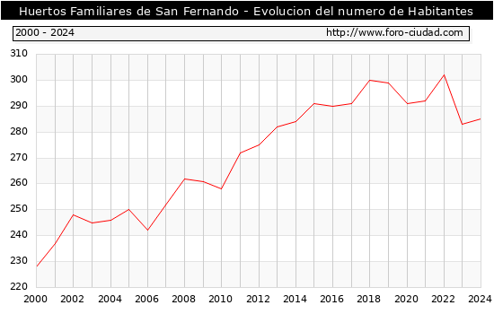 el numero de habitantes en Huertos Familiares de San Fernando era de 285, 2 habitantes mas que el en el año 2023. En el grafico siguiente se puede ver cuantos habitantes tiene Huertos Familiares de San Fernando a lo largo de los años.