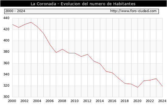Segun los datos publicados por el INE a 1 de Enero de 2024 el numero de habitantes en La Coronada era de 319, 14 habitantes menos que el en el año 2023. En el grafico siguiente se puede ver cuantos habitantes tiene La Coronada a lo largo de los años.