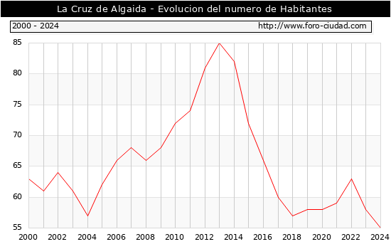 el numero de habitantes en La Cruz de Algaida era de 55, 3 habitantes menos que el en el año 2023. En el grafico siguiente se puede ver cuantos habitantes tiene La Cruz de Algaida a lo largo de los años.
