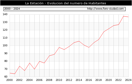 Segun los datos publicados por el INE a 1 de Enero de 2024 el numero de habitantes en La Estación era de 137, 1 habitantes menos que el en el año 2023. En el grafico siguiente se puede ver cuantos habitantes tiene La Estación a lo largo de los años.